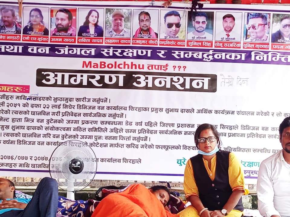 चुरे तथा वन जंगल संरक्षण अभियानीहरुको अमरण अनशन जनकपुरधाममा आज तेस्रो दिन पनि जारी
