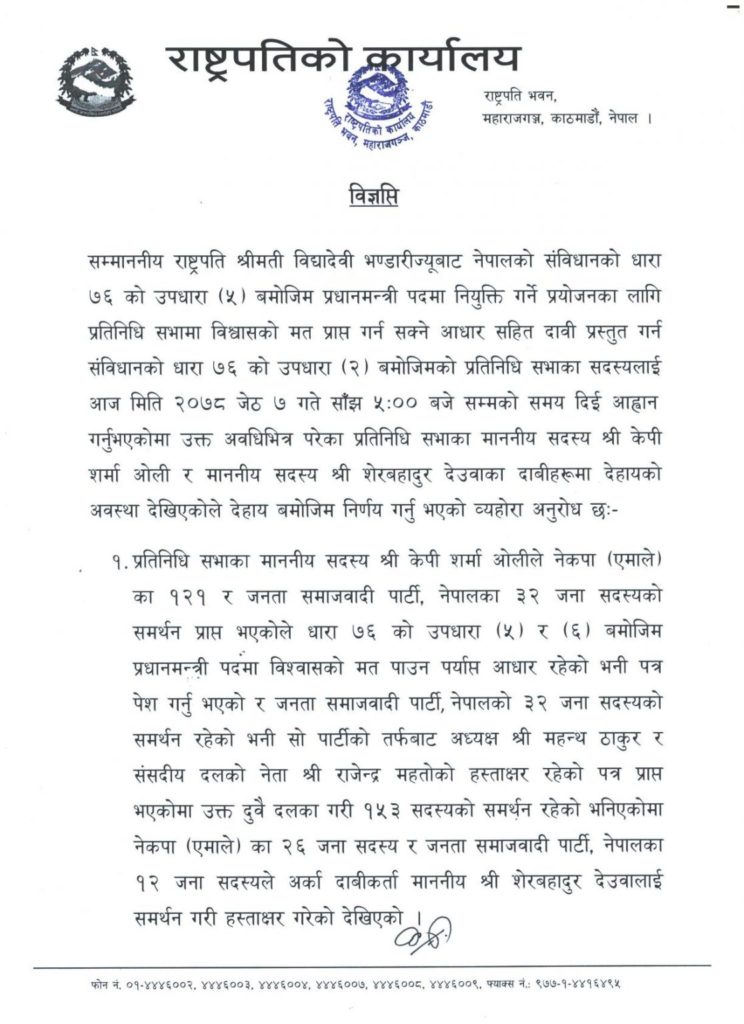 राष्ट्रपतिले २१ घण्टाको समय दिएर संविधानको धारा ७६(५) अनुसार प्रधानमन्त्री नियुक्तिका लागि संसदको विश्वासको मत प्राप्त गर्ने आधार पेश गर्न आह्वान गरेपछि ओली र देउवाले दाबी पेश गरेका थिए ।