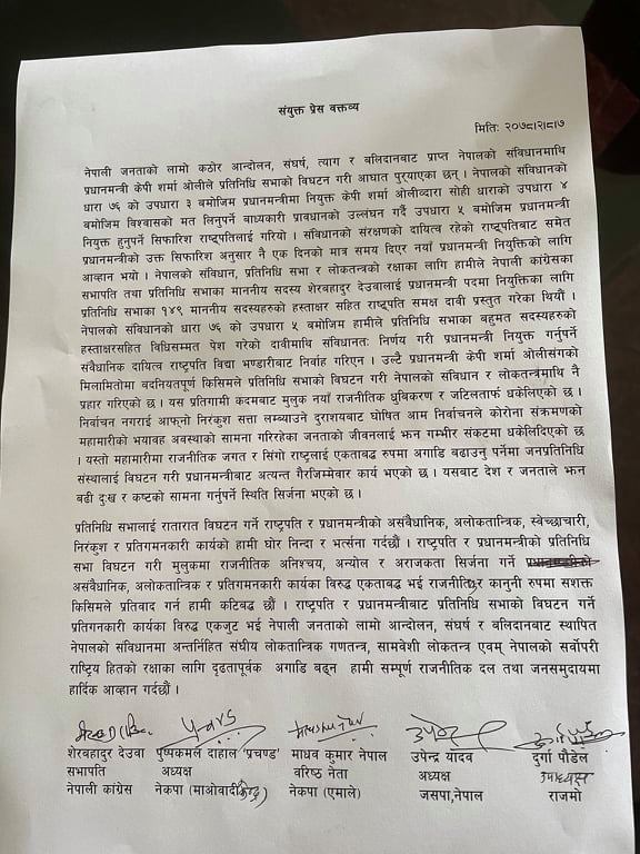 राष्ट्रपति र प्रधानमन्त्रीको प्रतिनिधिसभा विघटन गरी मुलुकमा राजनीतिक अनिश्चय , अन्योल र अराजकता सिर्जना गर्ने असंवैधानिक, अलोकतान्त्रिक र प्रतिगमनकारी कार्यका विरुद्ध एकताबद्ध भइ राजनीतिक र कानुनी रुपमा सशक्त किसिमले प्रतिवाद गर्न हामी कटिबद्ध छौं’, काँग्रेस सभापति शेरबहादुर देउवा, माओवादी केन्द्रका अध्यक्ष प्रचण्ड, एमाले वरिष्ठ नेता माधव कुमार नेपाल, जसपा अध्यक्ष उपेन्द्र यादव र जनमोर्चाकी दुर्गा पौडेलले जारी गरेको संयुक्त वक्तव्यमा भनिएको छ ।