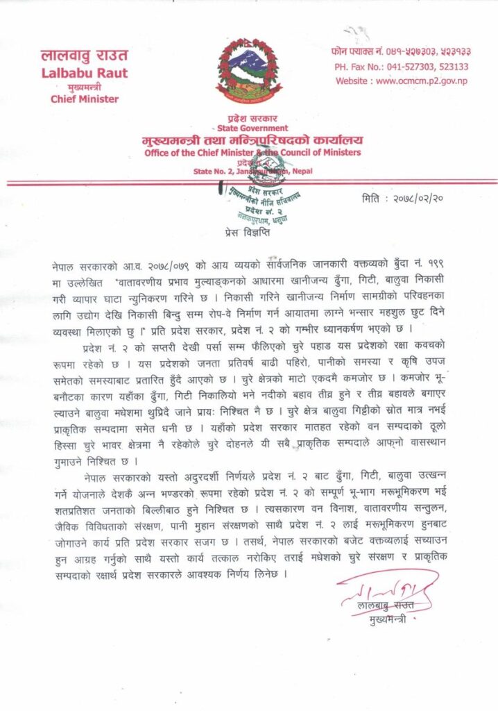 संघीय सरकारले यस कार्यलाई तत्काल नरोके तराई मधेशको चुरे संरक्षण र प्राकृतिक सम्पदाको रक्षार्थ प्रदेश सरकारले आवश्यक निर्णय लिने विज्ञप्तिमा उल्लेख छ।