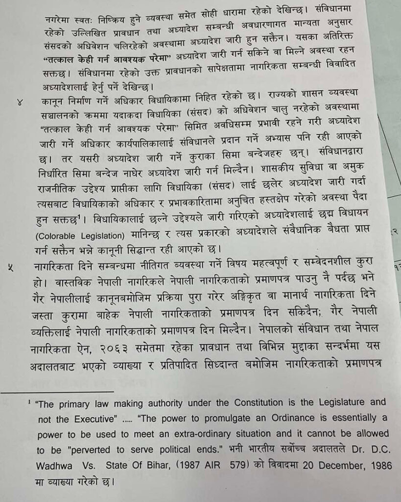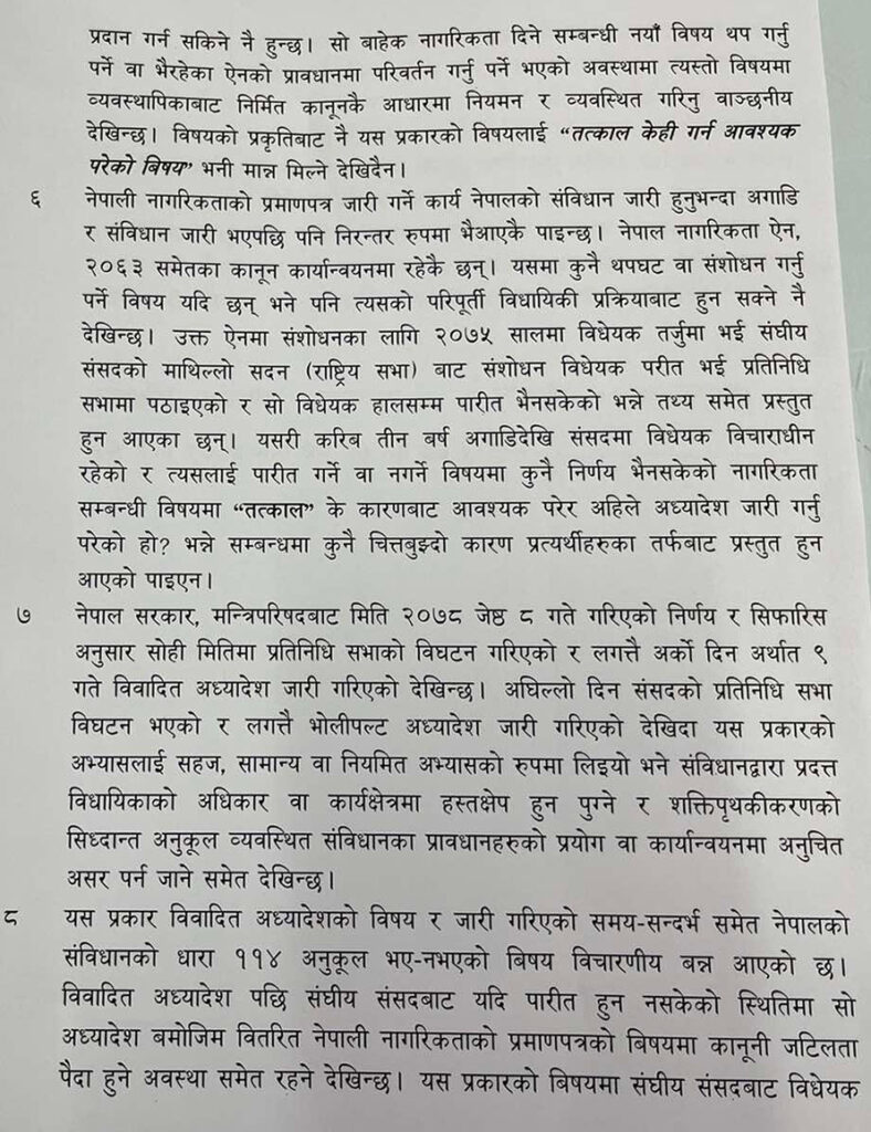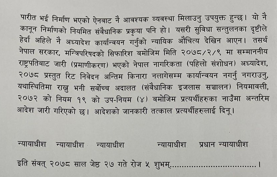 संघीय संसदबाट विधेयक पारित भई निर्माण भएको ऐनबाटै नागरिकता वितरणको व्यवस्था मिलाउन उपयुक्त हुने भन्दै सर्वोच्च अदालतले नेपाल नागरिकतासम्बन्धी (पहिलो संशोधन) अध्यादेश, २०७८ तत्काल कार्यान्वयन नगर्न सरकारका नाममा अन्तरिम आदेश जारी गरेको छ ।