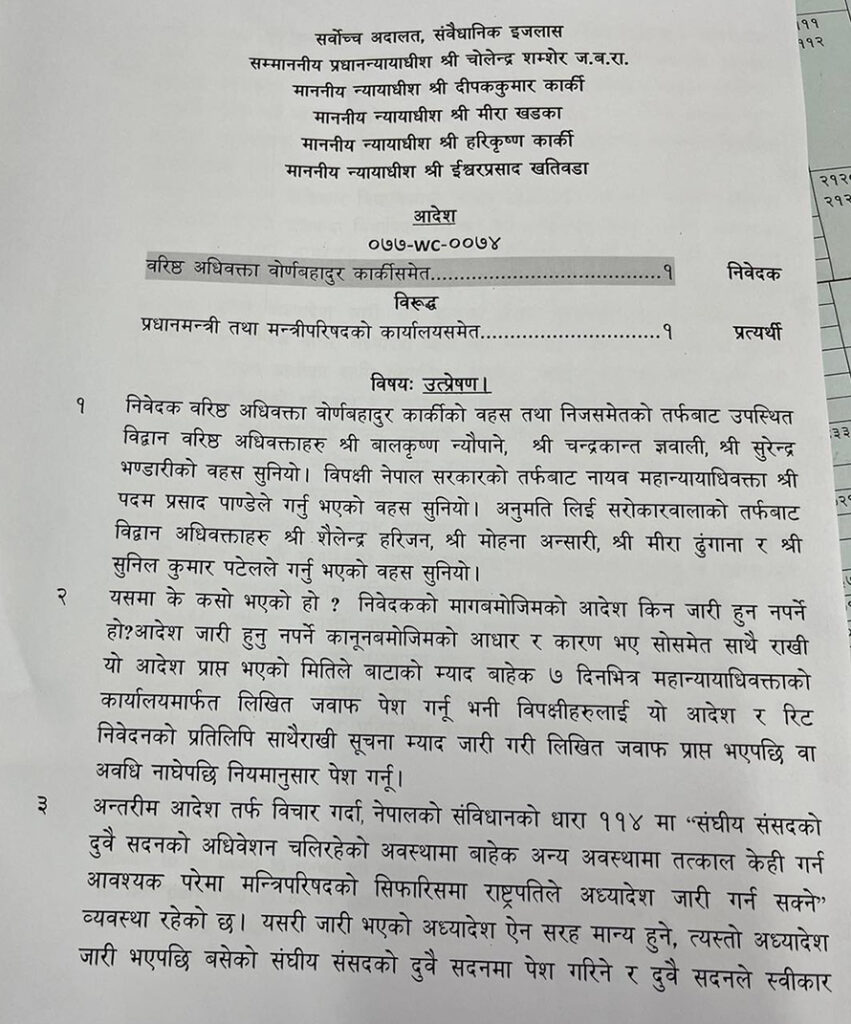 प्रधानन्यायाधीश चोलेन्द्रशम्शेर जबरा तथा न्यायाधीश दीपककुमार कार्की, मीरा खड्का, हरिकृष्ण कार्की र ईश्वरप्रसाद खतिवडाको संवैधानिक इजलासले बिहीबार अध्यादेश कार्यान्वयन नगर्न अन्तरिम आदेश जारी गरेको हो ।