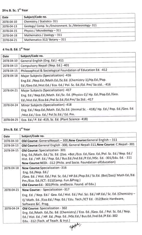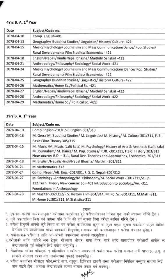 तीन वर्षे मानविकी शंकायको वार्षिक परीक्षा साउन १० गतेदेखि सञ्चालन हुने भएको छ। तालिका अनुसार साउन २८ गते परीक्षा सकिने छ। त्यस्तै, चार वर्षे बिएको पनि १० गतेदेखि परीक्षा सुरु भई २९ गते सकिने छ। परीक्षा साउन १० गतेदेखि सुरु भई २५ गते सकिने छ।