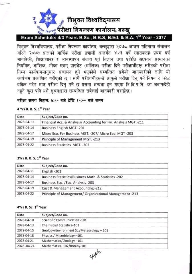 चार वर्षे तथा तीन वर्षेको बिबिएसको परीक्षा साउन ११ गतेदेखि सञ्चालन हुने त्रिविले जनाएको छ ।