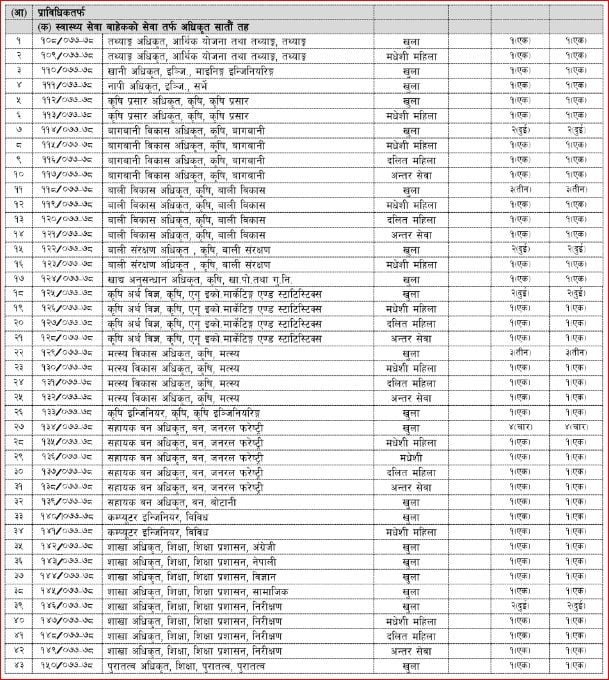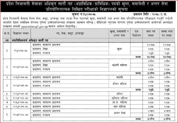 यसैगरी खुला समावेशी र अन्तर सेवा प्रतियोगितात्मक लिखित परीक्षामार्फत पदपूर्ति गर्नका लागि अधिकृत सातौँ तह प्रशासन सेवा (अप्राविधिक), प्राविधिक तर्फ तथ्याङ्क, इन्जिनियरिङ, कृषि, वन र शिक्षा सेवाका सातौँ तहका अधिकृतको लागि विज्ञापन गरिएको छ ।