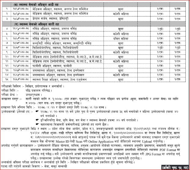यस्तै खुला प्रतिस्पर्धामार्फत पूति गर्न प्राविधिकतर्फ स्वास्थ्य सेवाको अधिकृत आठौँ तह र अधिकृत सातौँ तहको लागि पनि विज्ञापन गरिएको छ ।