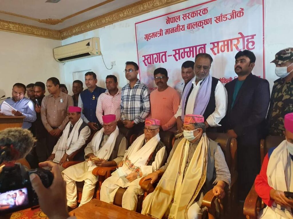 गृहमन्त्री बालकृष्ण खाँडलाई मैथिली विकास कोष जनकपुरधामले एक करिक्रम बीच मंगलवार जनकपुरधाममा भव्य स्वागत तथा सम्मान गरेको छ। केही दृश्य