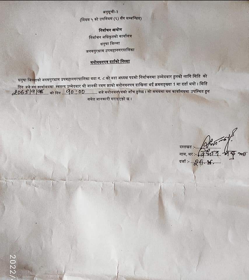 जनकपुरधाम उपमहानगरपालिका वडा ८ को वडा अध्यक्ष पदमा जानकी रमण झाले स्वतंत्र उमेदवारी दिनुभएको छ । उहाँले “आफ्नो विकास आफ्नो हाथ ” नारा संगै सकारात्मक बदलाबको लागि आफूले उम्मेदवारी दिएको समाजिक संजालमा उल्लेख गरेका छन् ।