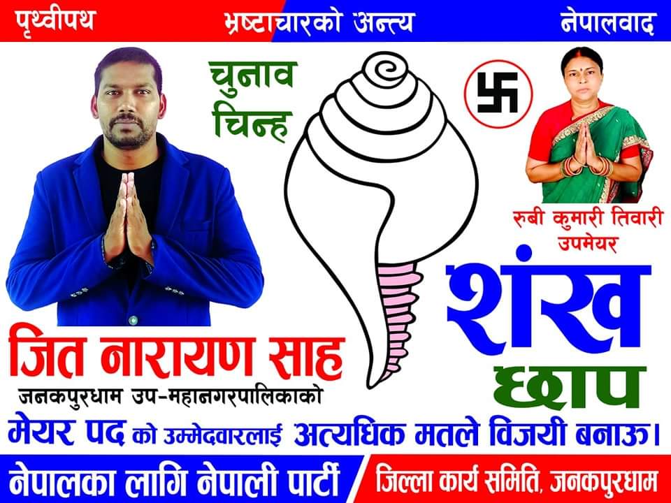 नेपालका लागि नेपाली पार्टी वाट जनकपुरधाम उपमहानगरपालिकाको मेयर पदमा जितनरायण साहले आफ्नो उमेदवारी दिनुभएको छ।
