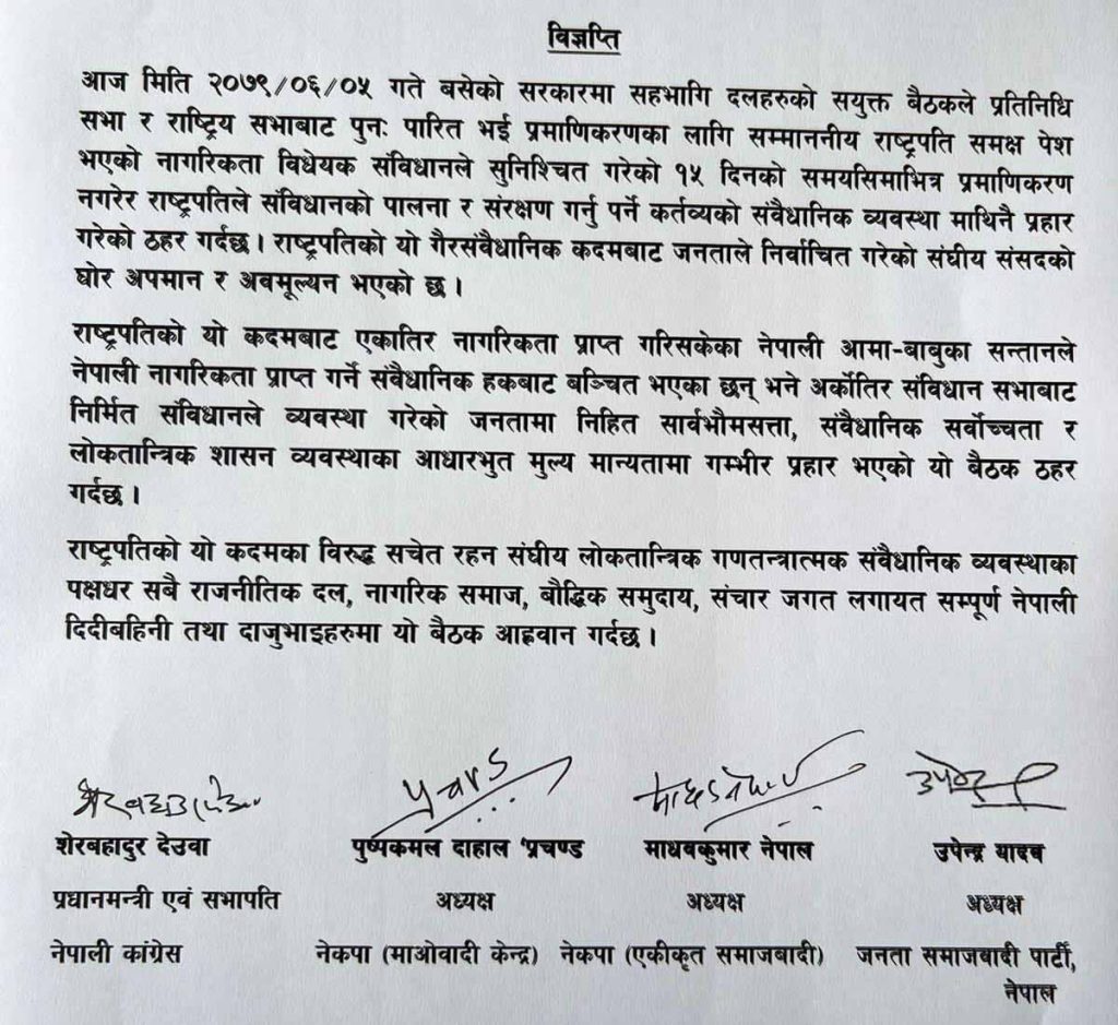 नेपाली कांग्रेस, नेकपा माओवादी केन्द्र, नेकपा एकीकृत समाजवादी र जनता समाजवादी पार्टीले संयुक्त विज्ञप्ति जारी गरी राष्ट्रपतिले संविधानको पालना गर्नुपर्ने कर्तव्यको संवैधानिक व्यवस्थामाथि नै प्रहार गरेको ठहर गरेको हो ।