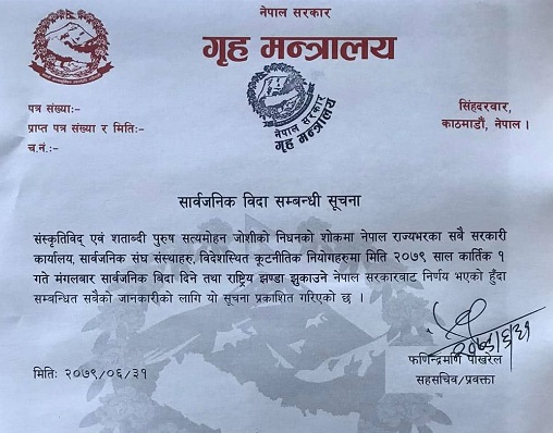 असोज ३१ काठमाडौँ | सरकारले वाङ्मय शताब्दी पुरुष सत्यमोहन जोशीको निधनमा भोलि मंगलबार सार्वजनिक बिदा दिने भएको छ ।