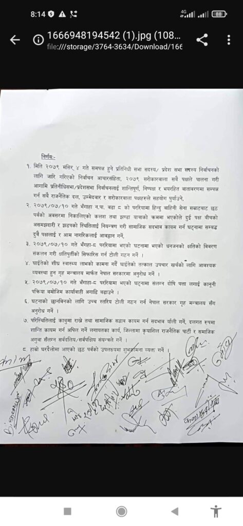 सर्वदलिय बैठकले भंगाहा नगरपालिका ८ को पररियामा हिन्दु वाहिनी सेना सम्राटबाट छठ पर्वको अवसरमा निकालिएको कलश तथा झण्डा यात्राको क्रममा असमझदारीका कारण दुई पक्षबीच सामाजिक सदभाव कायम गर्न घट्नामा सम्बद्ध दुवै पक्षलाई र आम नागरिकलाई आवहान गर्ने, घटनामा भएको धनजनको क्षतिको विवरण संकलन गरी क्षतिपुर्तीको सिफारिस गर्न टोली गठन गर्ने, घाईतेको शीघ्र स्वास्थ्य लाभको कामना गर्दै घाईतेको तत्काल उपचार खर्चको लागि आवश्यक व्यवस्था हुन गृह मन्त्रालय मार्फत नेपाल सरकारमा अनुरोध गर्ने लगायतका निर्णय गरेको प्रजिअ पहाडीले बताए । यस्तै, घट्नामा संलग्न दोषि पत्ता लगाई कानूनी पक्रिया बमोजिम कार्यावाही अगाडि बढाउने, घटनाको छानविनको लागि उच्च स्तरिय टोली गठन गर्न नेपाल सरकार गृह मन्त्रालय सँग अनुरोध गर्ने, परिस्थितिलाई काबुमा राख्ने तथा सामाजिक सद्भाव कायम गर्न सदभाव ¥याली गर्ने, दलगत रुपमा शान्ति कायम गर्न अपिल गर्ने लगायतका निर्णय भएको प्रमुख जिल्ला अधिकारी दीपक कुमार पहाडीले जानकारी दिए । पहाडीले बताए ।