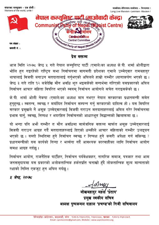 प्रचण्डले सरकार प्रमुखले नै स्वतन्त्र, स्वच्छ र मर्यादित निर्वाचन गराउनुको सट्टा कुनै उम्मेदवारको पक्षमा अपिल गर्नु स्वच्छ र निष्पक्ष निर्वाचनको आधारभूत सिद्धान्त विपरीत भएको बताएका छन् । एमाले उम्मेद्वार रामबहादुर थापालाई विजयी बनाउन ओलीले मतदातालाई गरेको अपिलप्रति गम्भीर ध्यानाकर्षण भएको दाहालको सचिवालयले जनाएको छ। बुधबार प्रधानमन्त्री ओलीले नेकपा एमालेका मतदातालाई आफ्नो पार्टीका उम्मेदवारलाई मत दिन र नदिए क्षम्य नहुने भनी विज्ञप्ति जारी गरेका थिए ।