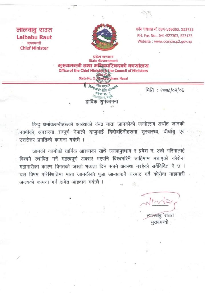 जानकी नवमीको अवसरमा मुख्यमन्त्री लालबाबु राउतले एक शुभकामना संदेश जारी गर्दै जानकी नवमीको धार्मिक आस्थाका साथै जनकपुर र प्रदेश २ कै गरिमालाई विश्वमै स्थापित गर्ने महत्वपूर्ण अवसर भएपनि कोरोना फैलिएको कारण भव्यता दिन नसकेको बताउनु भएको छ ।