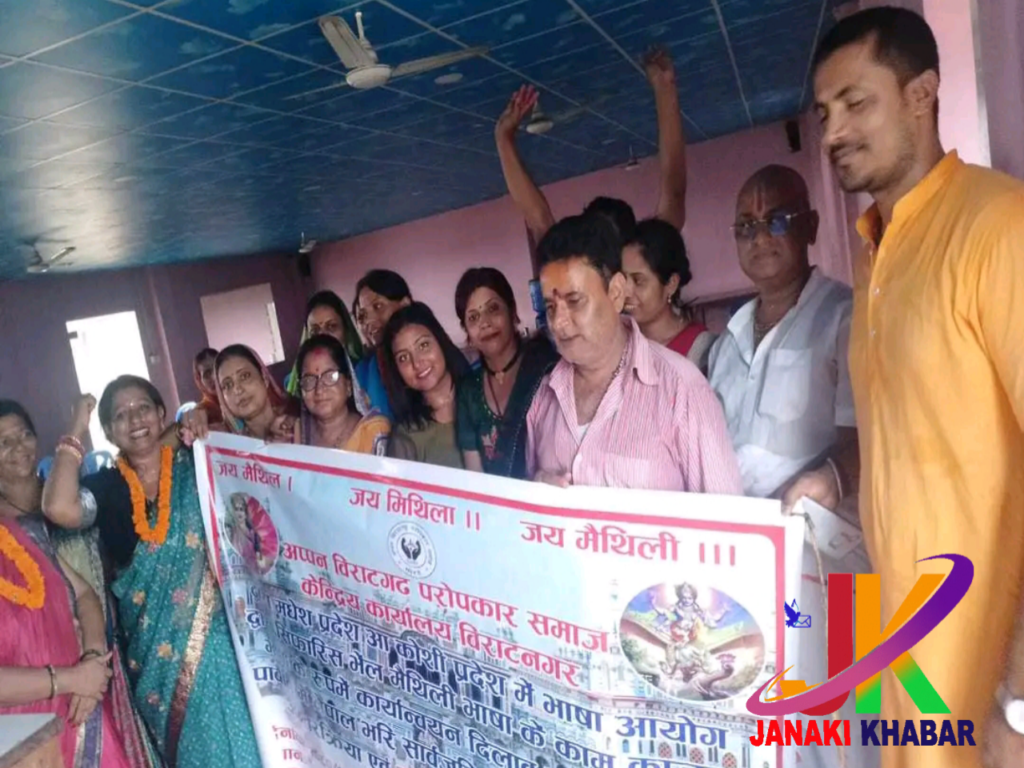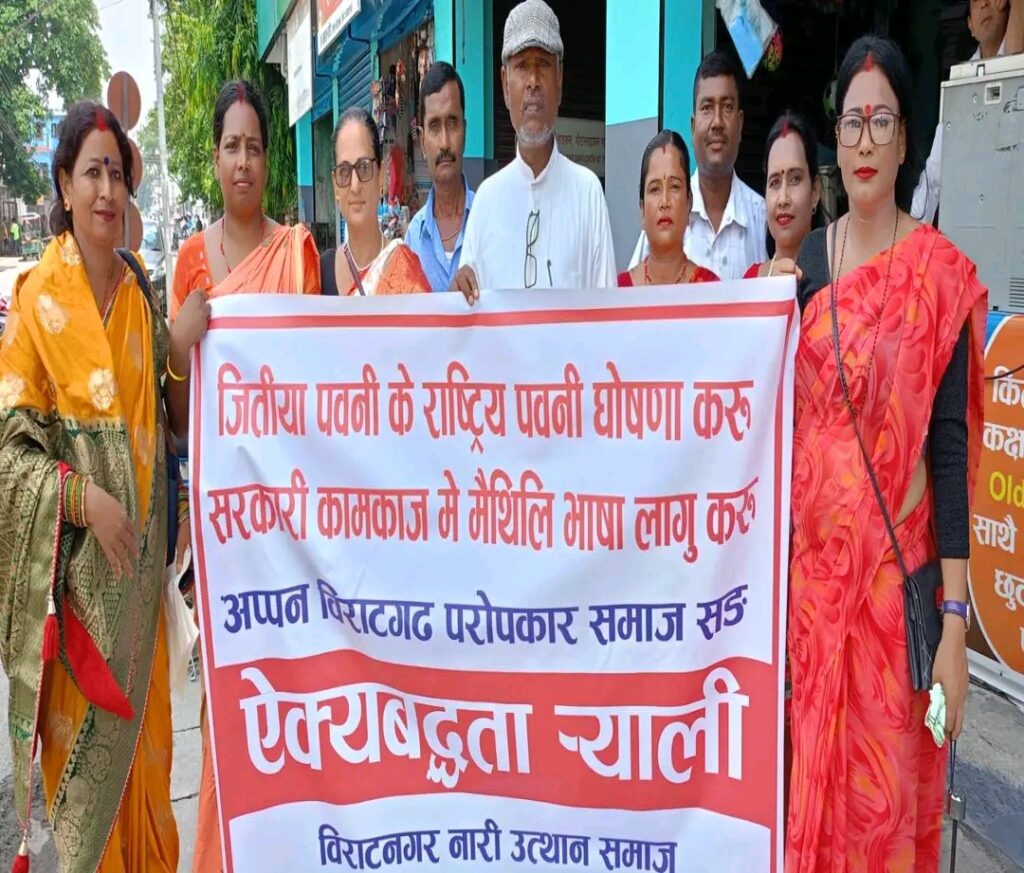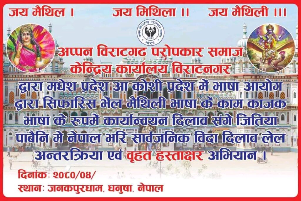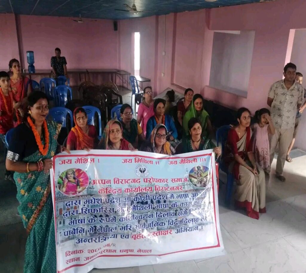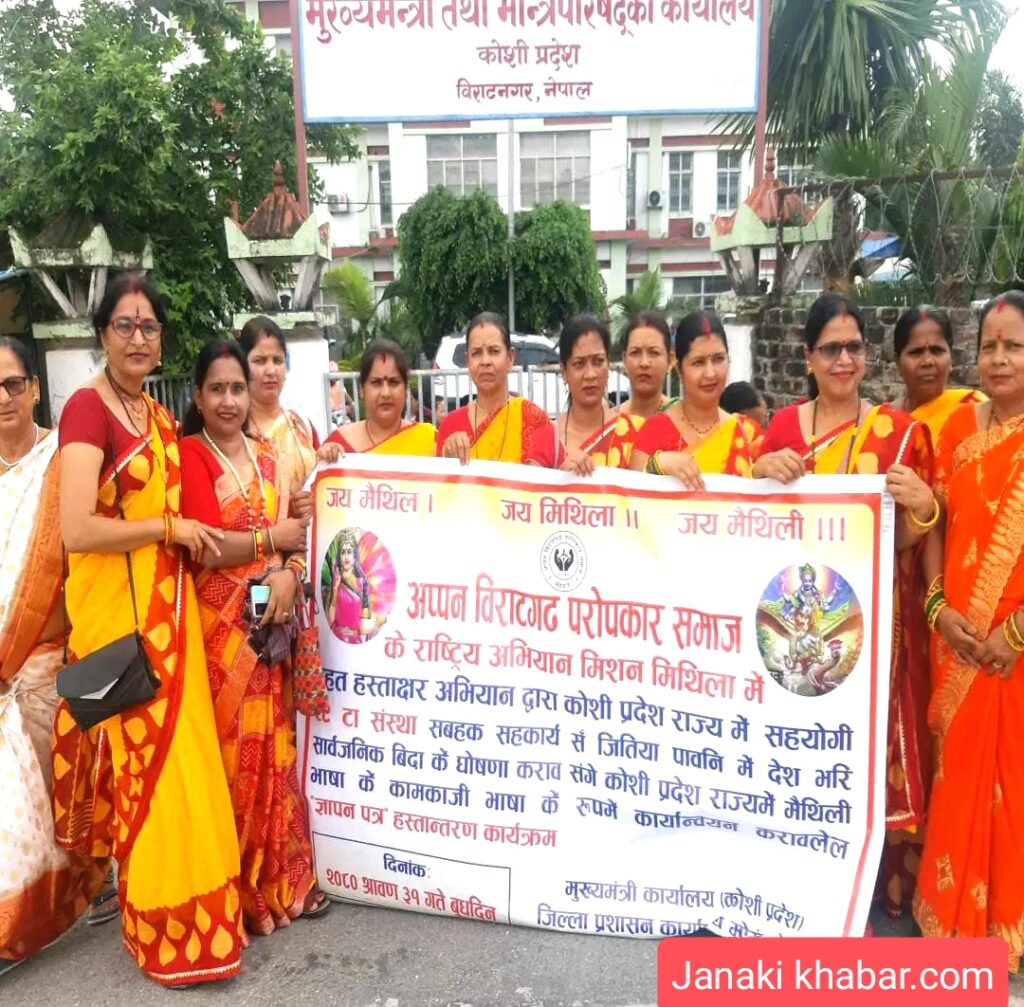 उहाँले अप्पन विराटगढ परोपकार समाज केन्द्रीय कार्यालय बिराटनगरले मिति २०८०/०४/०६ गते सोमवारका दिन जनकपुरको वडा नं.४ पिडरियामाई चौक स्थित श्री युरेका इन्टनेशनल हाइ स्कुलको प्राङ्गणमा मधेश प्रदेशमा केही षड्यन्त्रकारी र स्वार्थी तत्वहरुले हिन्दी भाषा लाई कामकाजी भाषा बनाउनु पर्छ भन्ने आवाज उठाई रहेकाले हाम्रो अस्तित्व र पहिचान मेटाउन खोजी रहेका ले मिथिलाञ्चलको सु-समृद्ध भाषा मैथिली लाई नै कामकाजी भाषा बनाउन भाषा आयोग ले सिफारिस गरेका ले हामी पनि बहुसंख्यक आम जनता मैथिली भाषाकै पक्षमा रहेकाले हामी मैथिली भाषा लागू गराउनु संग संगै मिथिला मधेशको महान पर्व जितिया लाई राष्ट्रिय पर्वको रुपमा स्थापित गराउनु संगै देश भरी सार्वजनिक बिदा गराउन दवाब स्वरुप “अन्तरक्रिया र बृहत् हस्ताक्षर अभियान” मैथिली अभियानी श्रीमती भारती झाको अध्यक्ष र जानकी मन्दिरका उत्तराधिकारी महन्त रामरोशन दास बैष्णवको प्रमुख आतिथ्य र श्री प्रेम चन्द्र झा ,कमलेश झा , मोहन पासवान महर्षी ,अलसुद्दिन मिंया ,जानकी रमण झा ,स्मिता झालगायत सैंकडौं जनसहभागितामा कार्यक्रम सम्पन्न भएको थियो।कार्यक्रम अप्पन विराटगढ परोपकार समाज कि अध्यक्ष श्रीमती बसुन्धरा झा ज्यु को संयोजकत्वमा सम्पन्न भएको बताउनुभयो।