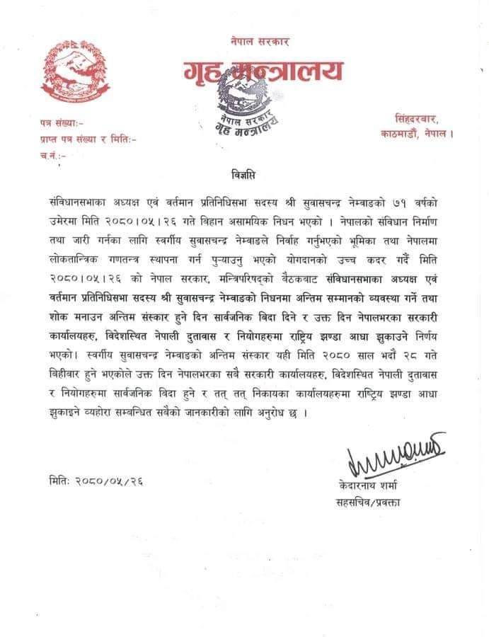काठमाडौँ । संविधान सभाका अध्यक्ष तथा नेकपा एमालेका उपाध्यक्ष सुवास नेम्वाङको निधनमा बिहीबार शोक बिदा दिने सरकारले निर्णय गरेको छ । वर्तमान प्रतिनिधिसभा समेत रहेका नेम्वाङको ७१ वर्षको उमेरमा मंगलबार बिहान असामयिक निधन भएको थियो ।